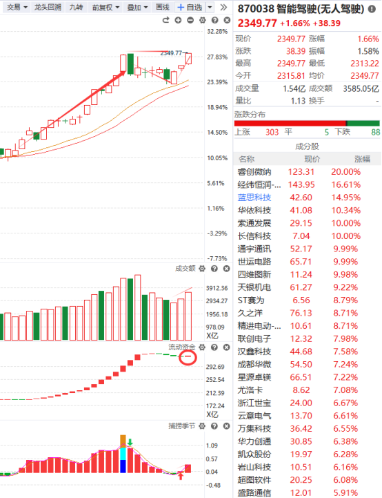 智能驾驶的走势跟人形机器人如出一辙,成交量呈持续放量状态,流动资金翻红,捕捞季节收出金叉,而且它今天的上涨让它突破前提横盘箱体区间,虽然没有突破很多,但起码出现好转的信号,后续继续留意它能否强势突破箱体,若能那么它后续有望走出非常强势的上涨行情。