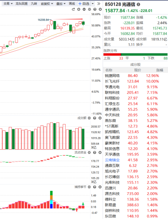光通信板块在站上智能辅助线之后走出持续上涨走势,只是今天的上涨遇到上方阶段高点所形成的压力,于是遇压回落,指标方面好坏参半,捕捞季节收出金叉,但流动资金翻绿,成交量缩量,所幸是它离辅助线并不远,趋势还没有彻底走坏,仍可以持续关注,若后期它无法突破压力位且趋势走坏并跌破辅助线支撑,则可以及时离场。