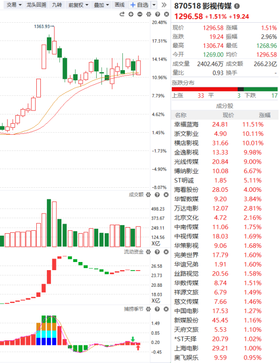 近期跟春节消费有关的板块都迎来不同程度的上涨,像酒店餐饮、景点旅游、食品饮料、航空运输等等,而看电影也是过年期间的一个比较习以为常的娱乐活动,势必会推动相关影视传媒板块的上涨,操作手法逢调整积极介入。