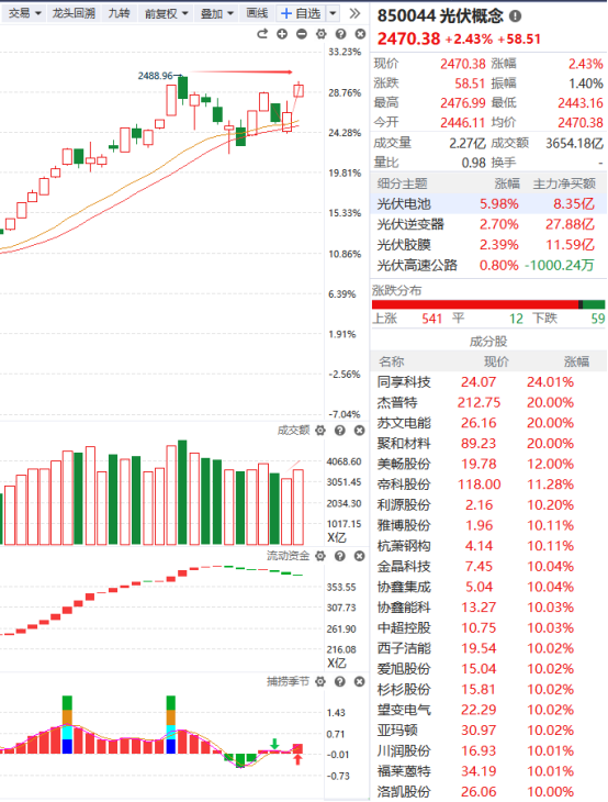 光伏概念近期的走势很好,处于控盘回档金叉的初期,只是流动资金还未实现翻红,而且它也面临着上方反弹阶段高点的压力,后续需要重点留意它能否突破前期反弹的压力位,若能的话有机会迎来不错的上涨行情。