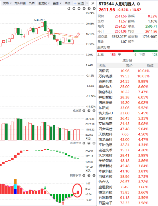 人形机器人板块在底部逐渐企稳并展开震荡上涨走势,目前来说趋势没有问题,就是指标方面差了一点,还有就是它离辅助线太近了,随便一个调整就跌破了支撑,不过该方向未来的成长空间还是不错的,继续轻仓持股待涨即可。
