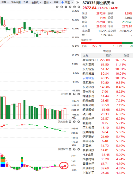 商业航天经过前面的持续下跌,目前风险已经释放得差不多了,而且从它的趋势以及各项指标来看,它正处于弱转强的初期,从政策层面来看,国家依然在积极地支持商业航天的发展,该方向未来的潜力肯定是无限的,只要它没有破位就可以持续跟踪,若中途有大的调整则可以适当加大仓位。