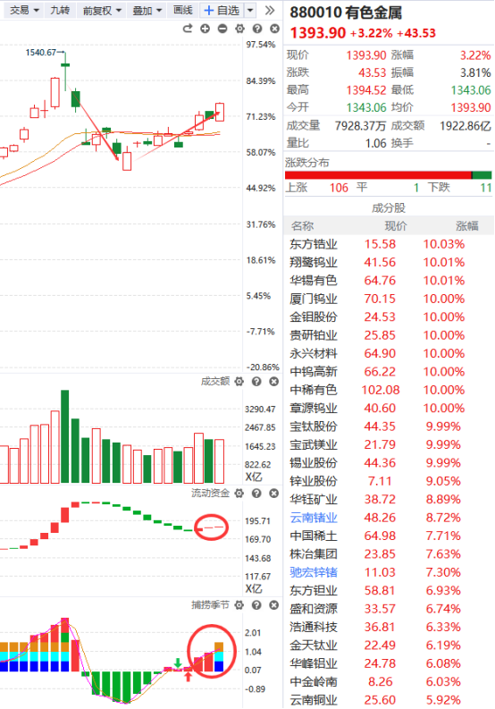 有色金属昨天经历较大幅度的调整,今天直接迎来反包行情,而且震荡的力度还比较大。只是目前各项指标的表现有点不太好,成交额呈缩量状态,流动资金翻绿,唯独捕捞季节还表现得比较强势。而布局该方向的投资者就意味着他们选择了防守,只要没有破位就可以长期持有。