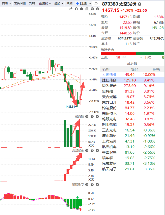 太空光伏盘中来了一波急速拉升,让它具备了冲击辅助线压制的动力,另一个方面得益于它自身的超跌反弹,目前它的各项指标开始由弱转强,若后续市场迎来修复行情,那么前期这些跌幅较大的方向都会有不错的上涨行情,值得持续关注。