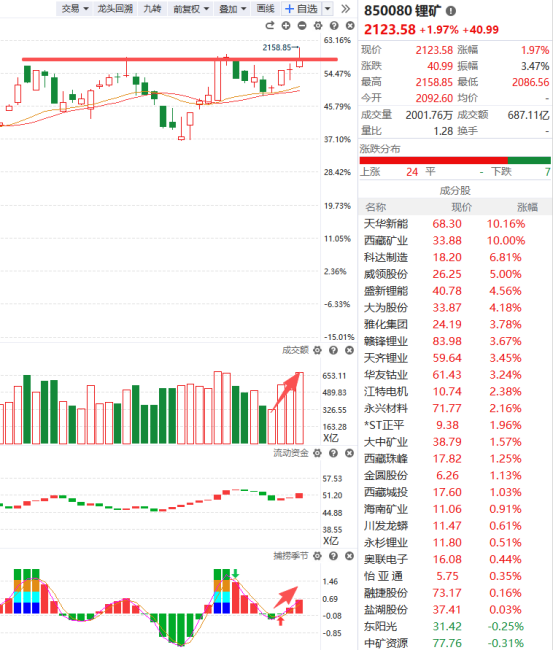 今日,午后锂矿概念再度活跃,威领股份直线拉升触及涨停,天华新能、西藏矿业、富临精工、天齐锂业、赣锋锂业、永兴材料等涨幅靠前。