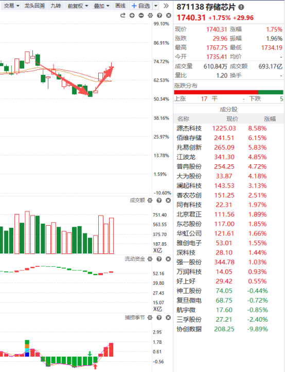 存储芯片概念跳空高开之后强势站上辅助线并走出趋势性行情,目前走势保持得非常不错,各项指标也呈现出比较积极的状态,只是捕捞季节收出了光头彩柱,近期要小心前期反弹高点平台的压力位,若能突破则会有不错主升浪行情,若突破不过去则会面临调整行情。