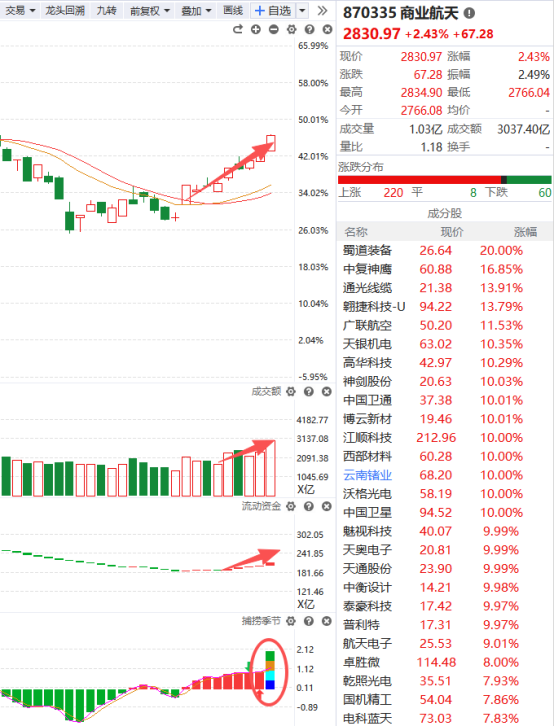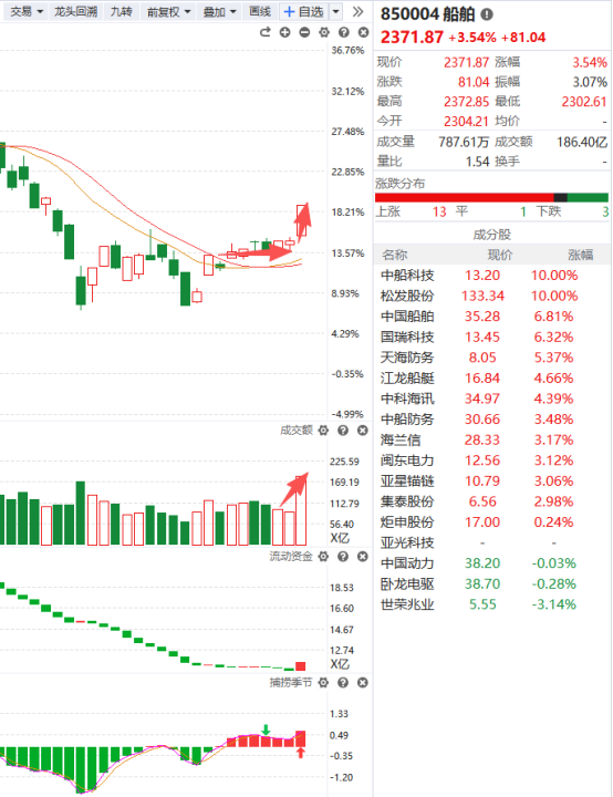 船舶板块前期在辅助线上方横盘震荡了很久,今天突然受到消息的刺激开始大幅上涨,而且流动资金开始翻红,捕捞季节收出金叉,属于行情启动的初期,目前市场正处于业绩披露的窗口期,资金肯定会特别青睐这种业绩超预期的板块,而且它本身所处的位置也不高,持有相关个股的继续持股待涨即可。