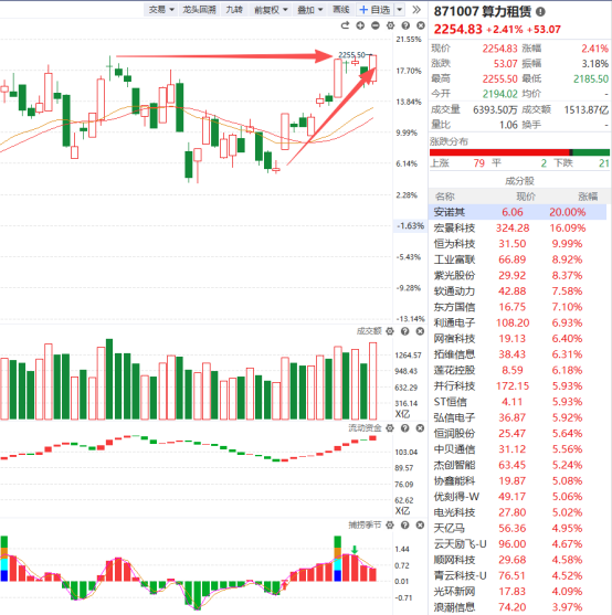 算力租赁板块昨天小幅调整,今天借助市场迎来全面修复行情,它又展开了大幅反弹行情,盘中最高点已经突破前期反弹的高点,它既然能突破前期反弹的高点,就说明上方的抛压有所松动,但它又没有强势突破,所以仍存在不确定性,仓位不重的可以再耐心等待一下,看它接下来究竟是继续突破上涨呢?还是就此下跌调整,存在比较大的不确定性,等市场做好选择我们再跟随就好了。