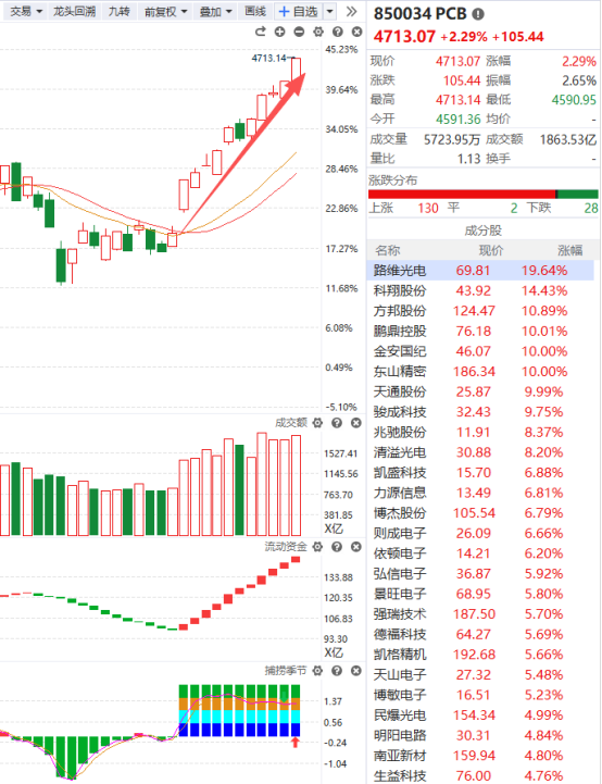 PCB概念近期一直走出了震荡上涨的走势,目前它的趋势没有问题,成交额呈逐步缩量状态,流动资金一直保持得非常好,可随着它收出历史新高,持仓的风险急速加剧,每次大幅上涨就是我们减仓的最好时机,如果你本身仓位比较重且以及赚取不少的收益,可以逐步落袋为安了。