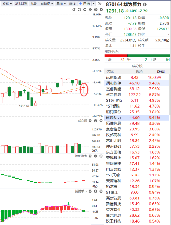 华为算力盘中收出金针探底形态,目前它在辅助线附近止住跌势,流动资金持续翻红,成交额呈放量状态,接下来就是把这种走势给稳住,稳住之后才有后续的上涨行情,板块方面已经表态了后面就要看市场给不给力了。