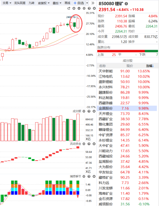 锂矿今天强势反包收出一根大阳线并创出历史新高,走势没有问题,指标方向也没有问题,但今天的大幅上涨也提前透支了该方向后续的上涨,而且按近期市场板块的轮动节奏来看,前一日涨幅过大的很容易在次日面临较大的调整行情,对该方向感兴趣的可以在调整时积极介入。