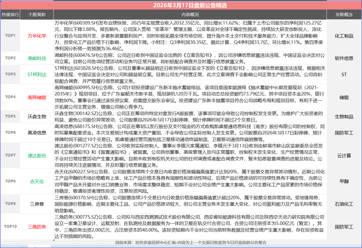 三房巷(600370.SH)公告称,公司股票连续3个交易日内日收盘价格涨幅偏离值累计超过20%,属于股票交易异常波动。受地缘局势、国际能源价格影响,近期主要化工品、公司产品价格波动较大,但公司主营业务未发生重大变化,对公司盈利能力及产品毛利率暂无明显影响。