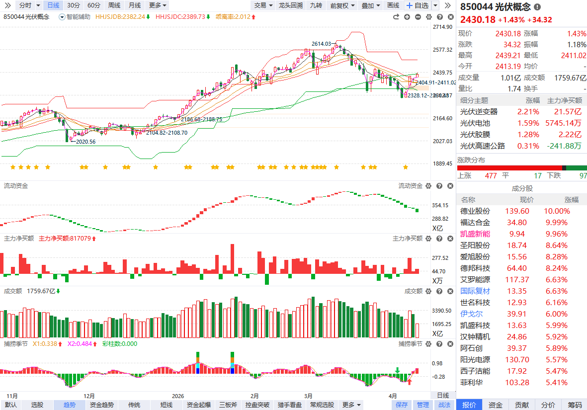 根据软件信号,板块近期流动资金持续翻绿,主力净买额红肥绿瘦,目前温和放量站上辅助线,趋势初步转强,后续需要留意资金能否快速翻红。如果缺少增量资金入场承接,短线反弹过后仍然容易再次出现分化,注意回避冲高追涨,耐心等待资金走强的回档节点;如果资金开始连续翻红,增量资金进场承接,有望形成趋势性反弹,可以积极关注人气股的60分钟回档博弈。