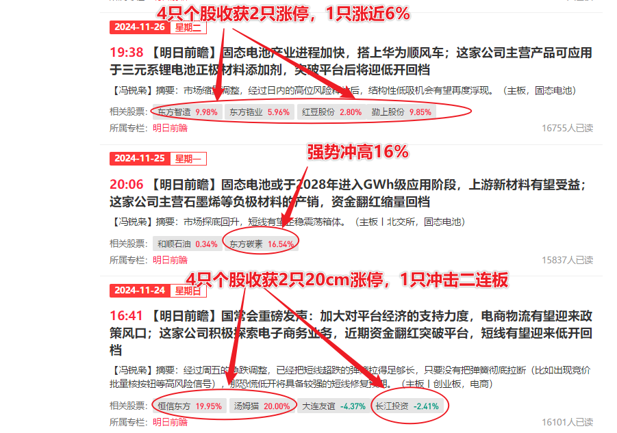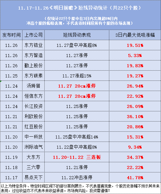 如果您还在烦恼怎么跟上风口和资金的动向,那不妨试着解锁一下我们主笔的经传王牌短线专栏,平均股价11月18日止跌以来,栏目提及的22只个股中,超过半数的个股(14只)都在3日内出现强势冲高异动!其中甚至包括多只像大东方(6天5板)、三六零(4天涨幅接近40%)、利欧股份(冲击二连板)、长江投资(冲击2连板)、红豆股份(冲击2连板)这样的短线小龙头!