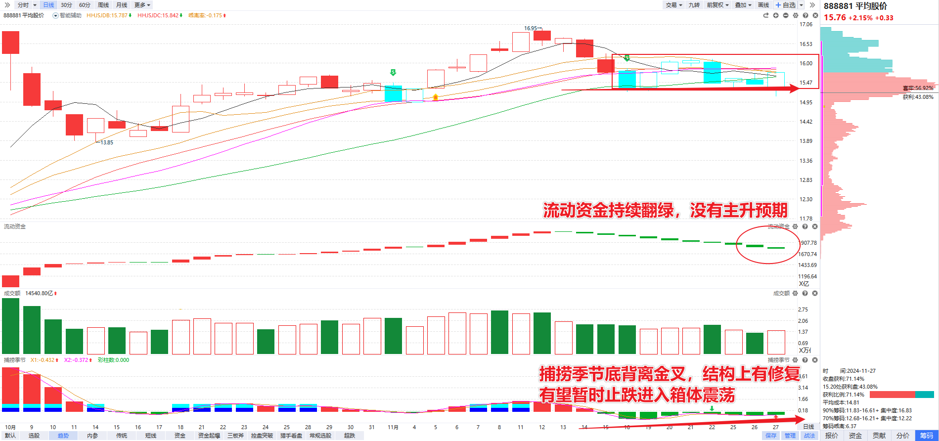 指数角度,大盘在券商发力之下强势收复3300点稳定基本盘,平均股价走出捕捞季节底背离金叉的修复结构,技术形态上有所修复,短线有望止跌企稳进入箱体震荡,但由于流动资金持续翻绿,仍然没有太强的主升预期,所以短线冲高后的60分钟死叉还是逢高降低仓位的节点,等60分钟死叉调整后的隔日竞价再聚焦低吸博弈的机会更具性价比。当然如果今天晋级的前排个股明天集体转强大单顶一字,同时平均股价平开或小幅低开给到性价比,那么也可以积极跟进主力爆量阳线的隔日低吸节点。同时也要警惕,如果明天高位个股延续弱势A杀,同时中低位活口不能明显加强,而平均股价和连板个股又集体抢高开,那就有诱多反杀的风险。