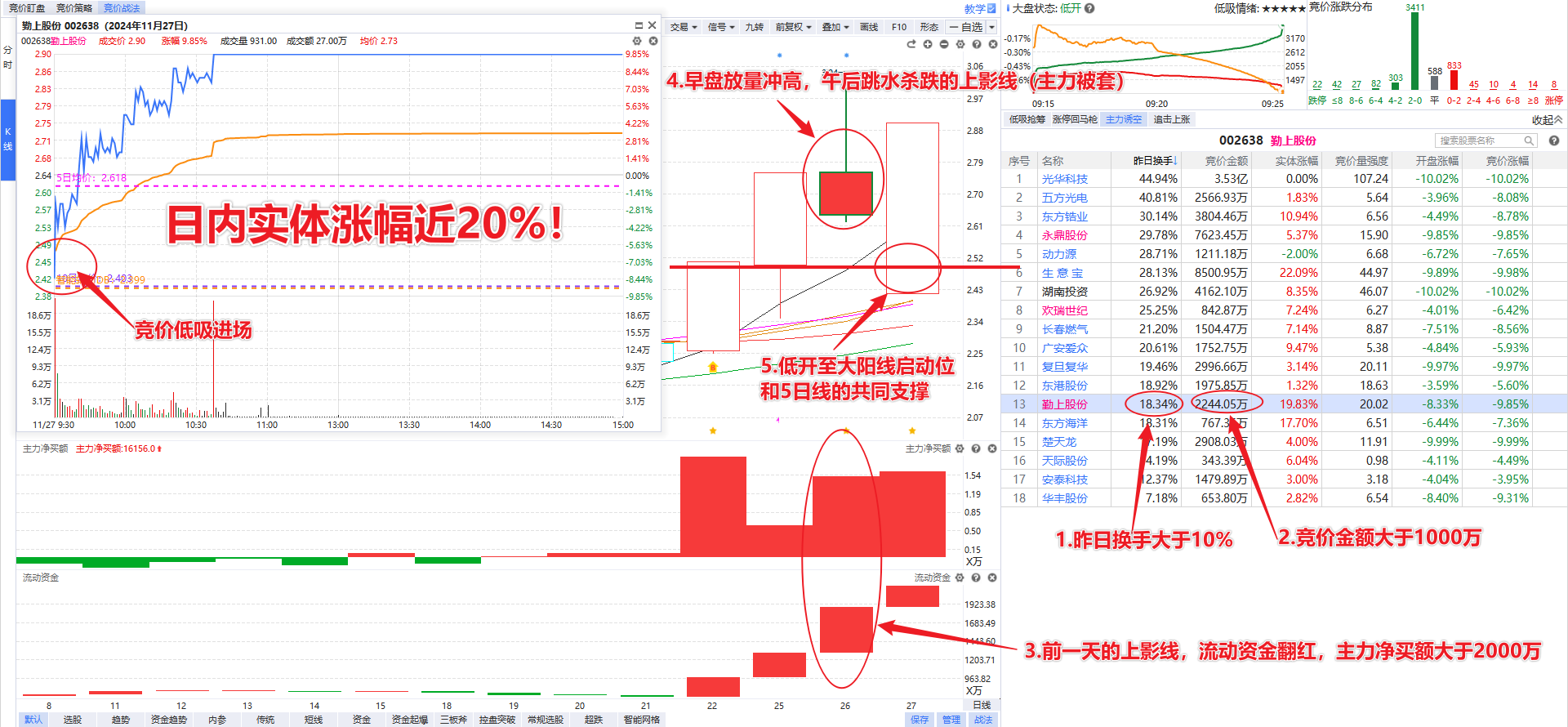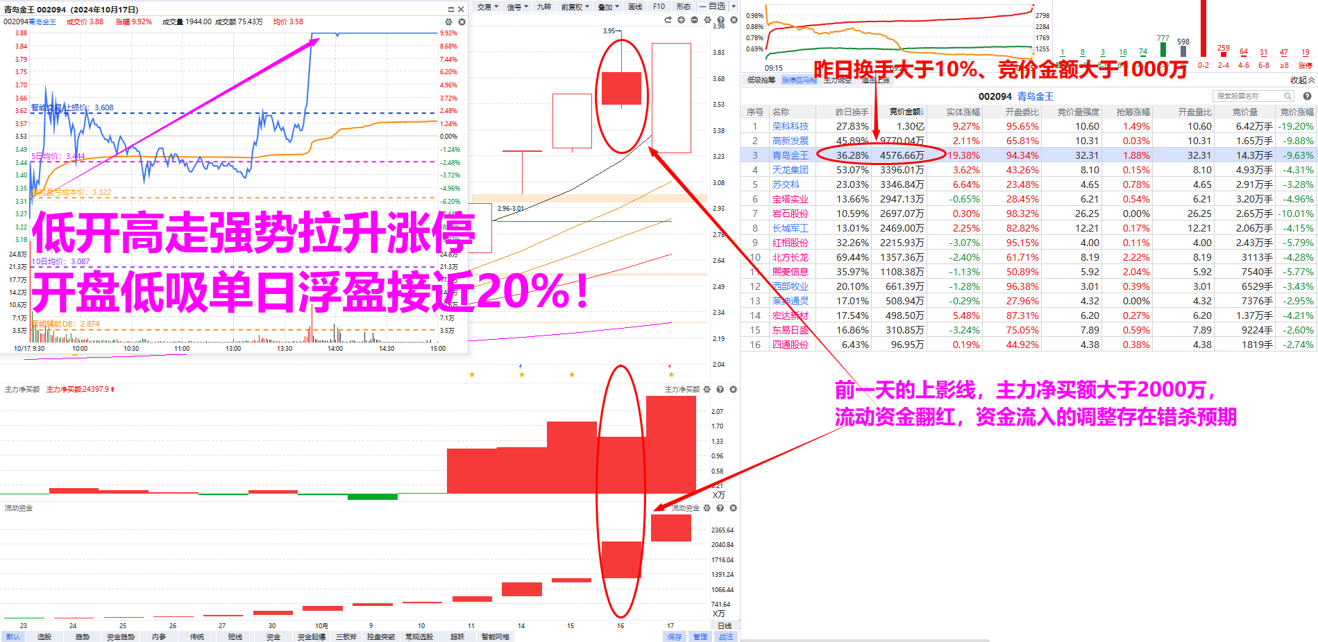 3、前一天的流动资金和主力净买额都要翻红,主力净买额最好大于2000万(有资金流入的调整,隔日修复的概率才更大);
