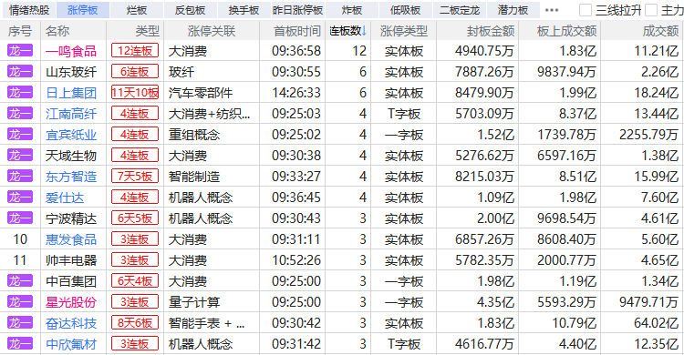 焦点股方面,大消费板块一鸣食品12连板、中百集团8天5板,机器人概念股爱仕达19天12板、建设工业8天7板,智能驾驶概念股日上集团11天10板。