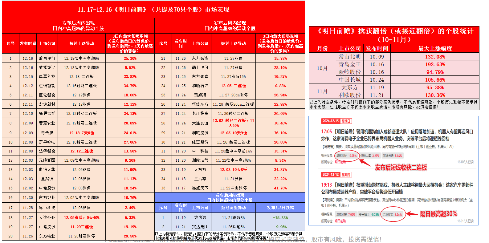行情回暖,您却还在烦恼怎么跟上风口和资金的动向?那不妨试着解锁一下我们主笔的经传王牌短线专栏,平均股价11月19日止跌以来,栏目几乎每晚的策略都出现了一周内强势异动(日内涨停或盘中冲高超8%)的品种,其中甚至不乏一些短线小龙头: