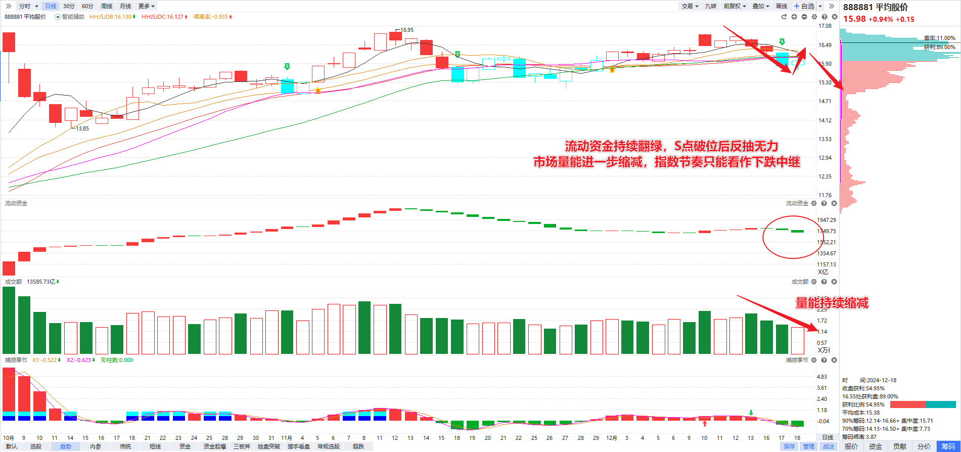指数角度,反抽是预期内的,连续大跌3天以后,多少还是会给个技术性反弹。但从反弹的质量来看,是远低于预期的,大盘和科创50一直被5日线压制,平均股价和创业板指全天被辅助线压制,基本没有一个指数能够走出强势反包,而市场的成交量也进一步缩减到1.3万亿,反弹没能吸引来场外增量资金的入场。所以今天的反抽,更多是给前面被闷杀得比较惨的资金一个“体面”离场的机会,并没有多少实质性的强度,暂时只能看作一个下跌中继的小反抽。