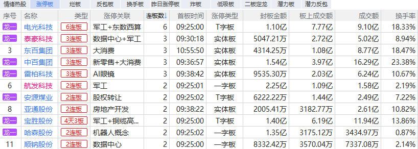 焦点股方面,昨6连板实益达跌停,电光科技T字涨停晋级6连板,中百集团缩量涨停录得20天12板3连板。