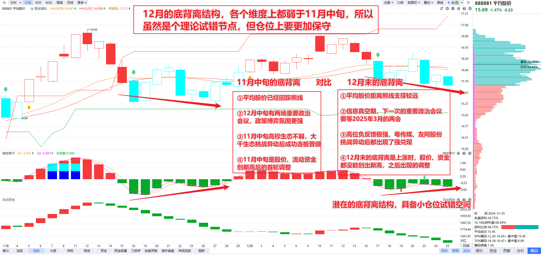 题材股在周四高潮以后冲高回落,算是预期内的分化,最近策略里也一直有提到,不能简单地把12月底的底背离直接对标11月中旬的底背离,因为不管是从政策消息层面还是从高位生态方面,都明显要弱一筹,所以在题材股反包大涨过后,因为踏空焦虑去追涨接力显然是不太理智的。