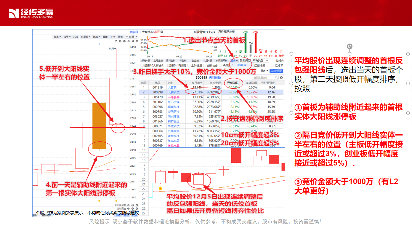 平均股价经过连续调整后,出现了首根反包强阳线,对于日内的低位实体大阳线首板,隔日如果竞价低开到大阳线实体一半的支撑位附近且出现主力抢筹(竞价金额大于1000万),具备一定的短线低开高走预期。