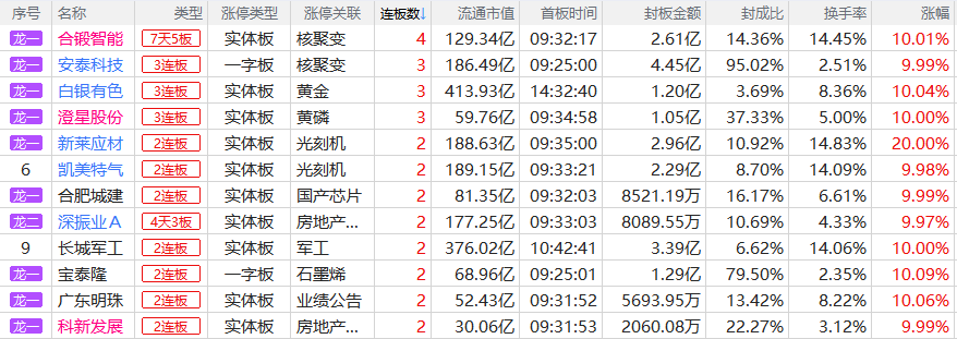 焦点股方面,可控核聚变概念股合锻智能10天6板、安泰科技3连板,六氟磷酸锂概念股天际股份6天5板、石大胜华5天3板,新凯来概念股深振业A8天4板、新莱应材20CM2连板。