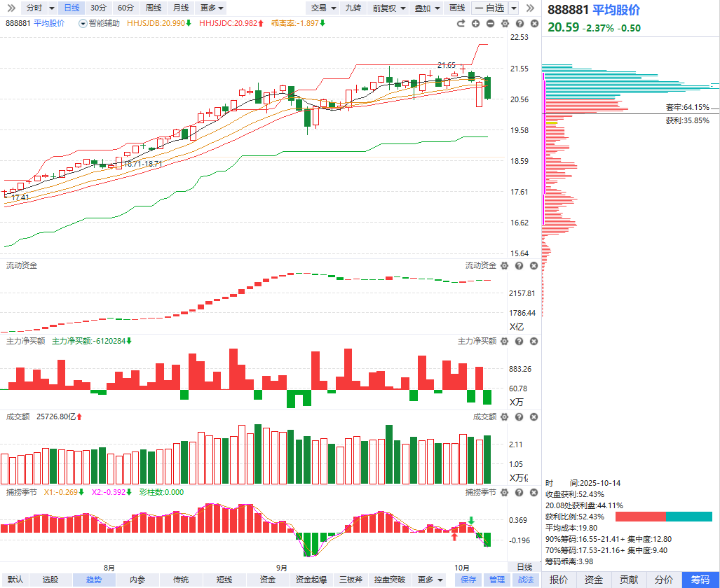 指数角度,平均股价高开低走全天回调,捕捞季节连续两个交易日进入绿柱弱势震荡区间,且日内阴包阳已经跌破周一阳线实体一半的支撑位,且题材亏钱效应明显,短期需要适当谨慎,仓位尽量控制在3-5成,耐心等待流动资金翻红的回档金叉出现。明天如果能惯性恐慌下探再捞起分歧转一致,可以留意共振题材,如果直接抢修复那持续性还是不好说。