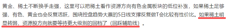 资源股方向,昨天也提过如果补涨的稀土走弱,那有色、黄金方向就需要等待更大级别的回档,今天稀土开盘兑现明显,中国稀土、包钢股份等都未能弱转强,那么午后黄金的回调也符合预期,后续需要起码看到在20日线附近出现止跌K线,才适合继续关注回来。