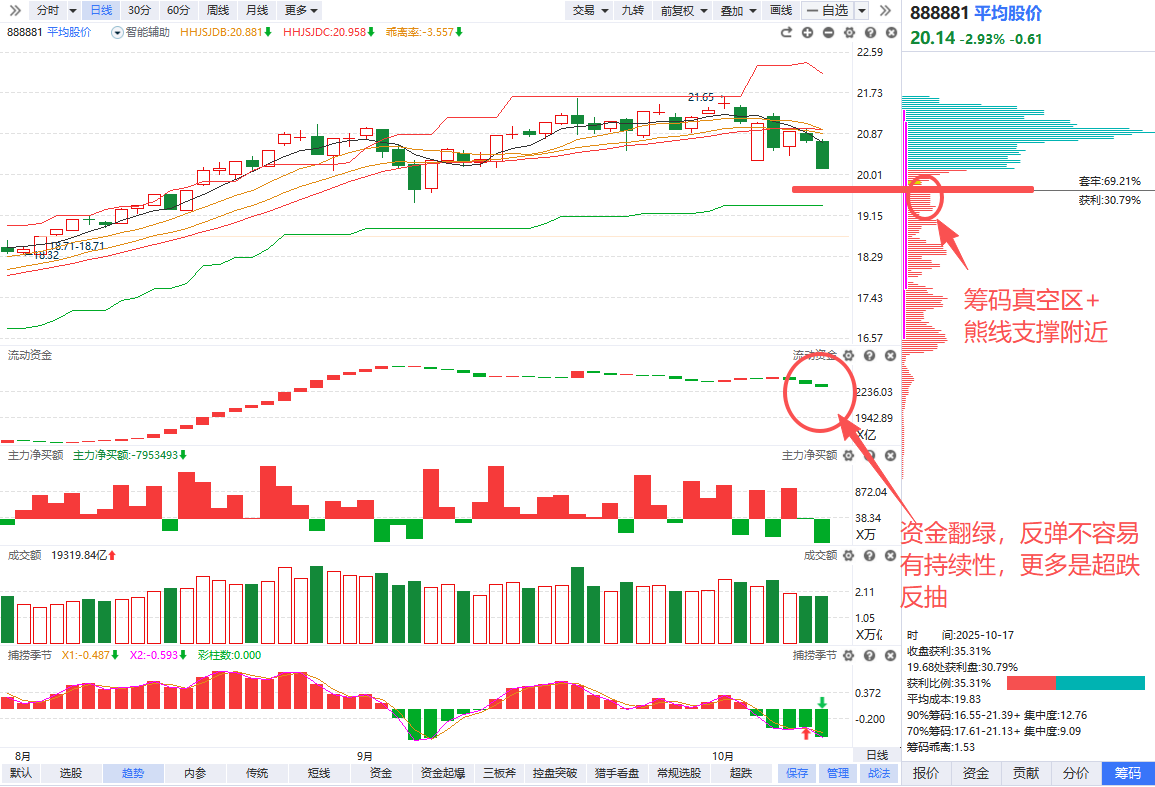 指数角度,平均股价的筹码呈现明显的“头重脚轻”形态,底部筹码完成高位派发,进入弱势震荡区域,短线暂时看筹码真空区+熊线附近的短线支撑能否出现止跌反弹的大长腿。如果周一惯性恐慌下探至支撑位,有望形成短线超跌反抽(如果不放量,持续性不一定强,可能当天低吸隔日就需要T掉,只适合超短做个T)。如果开盘直接抢反弹(竞价3000多家红盘且开盘直接拉升没有恐慌下探),就容易在短线反抽后再次反杀回落,更适合作为仓位重的朋友趁着反抽收缩仓位的节点而非新开仓的节点。
