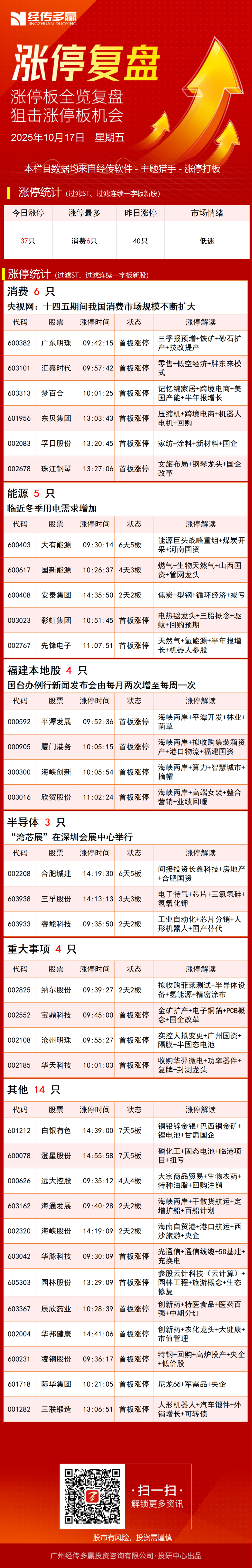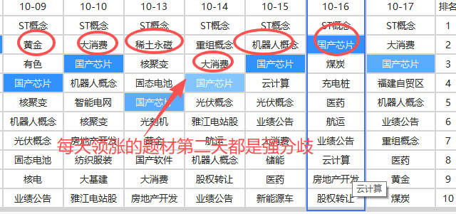 投机方向,连板梯队里3/4板是10月15日澄星股份、安泰断板高位大分歧后的补涨梯队(10月15日的首板/二板),2板梯队是天普股份复牌后的补涨(10月16日首板),里面会决出本轮周期的周期龙。从天际股份以后,连板高度一直被压制在4板,后面如果有能晋级5板且次日没有兑现的个股出现,会成为短线生态由弱震荡变为强震荡的信号(强主升生态则需要突破10天100%的异动压制)。