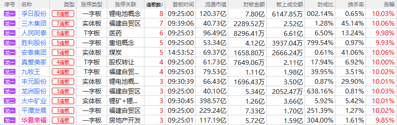 焦点股方面,福建本地股平潭发展22天14板、三木集团11天8板,锂电池板块孚日股份8连板、大中矿业14天7板。此外,煤炭股安泰集团上演“准天地天板”走出23天14板。