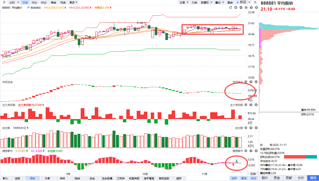 指数角度,-平均股价仍然维持箱体震荡,流动资金翻绿的死叉,需要注意控制整体仓位在3-5成以内,耐心等待死叉震荡3-4个交易日后缩量回踩11月5日阳线支撑位的回档节点,或流动资金重新翻红的增量资金进场节点。