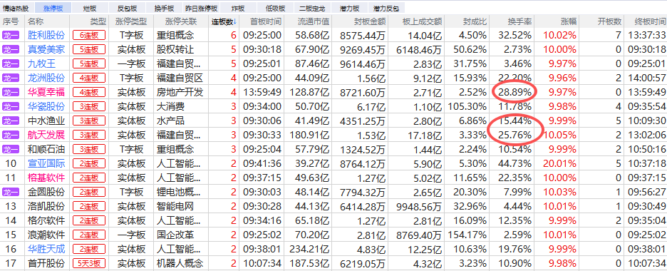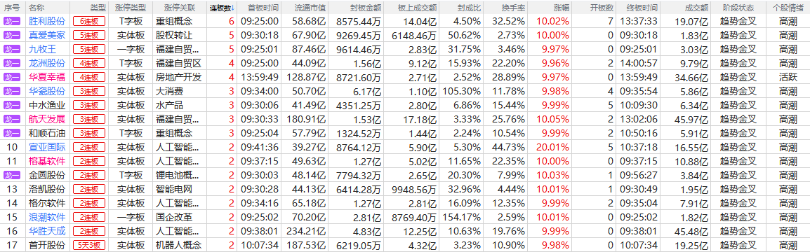 焦点股方面,市场连板高度降至6连板的胜利股份,实控人变更的真爱美家5连板,福建本地股九牧王5连板。