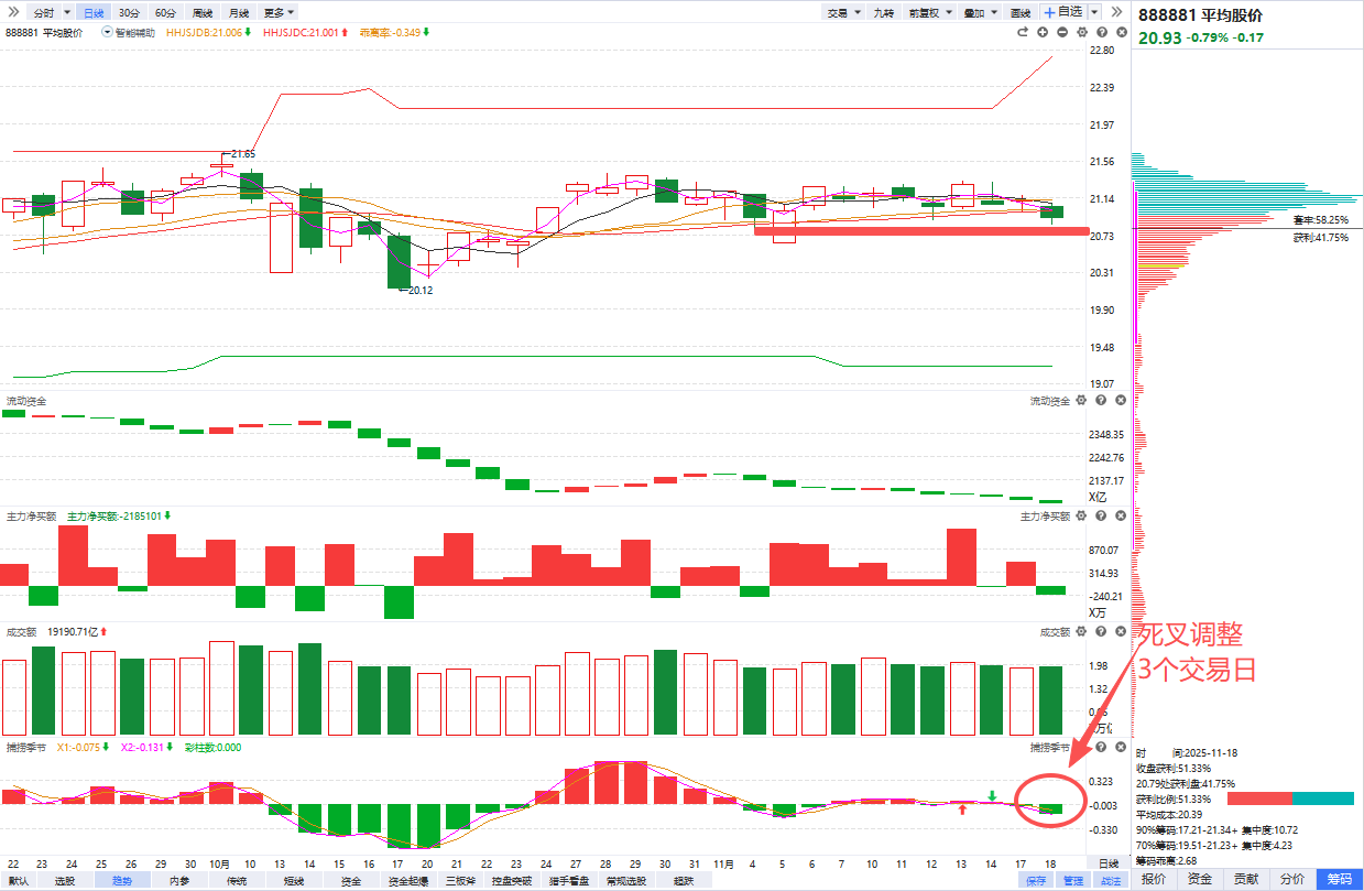 指数角度,平均股价进一步下探跌破辅助线形成S点,日内震荡加大。不过由于量化资金和护盘资金的存在,下半年以来经常出现S点破位后快速下探再反抽的走势,加上今天调整没有放量,没有量就没有足够的动能打破最近两个星期的震荡箱体,所以预计平均股价回踩11月5日大阳线实体一半/实体启动位+大盘3900点附近会形成第一个强支撑,如果市场没有集体放量下杀,就看止跌修复的预期。