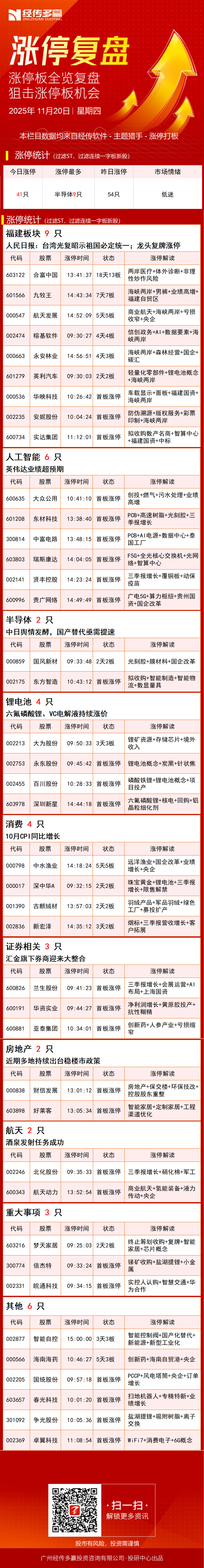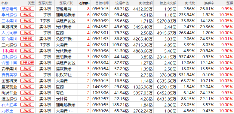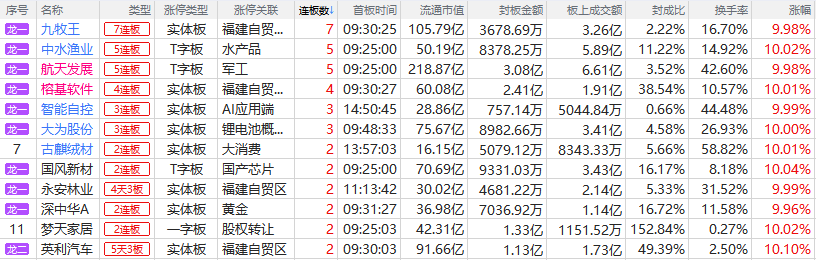 焦点股方面,福建板块反复活跃,合富中国复牌后再度涨停走出15天13板,九牧王上演“天地天”晋级7连板,叠加商业航天概念的航天发展5连板,叠加AI应用概念的榕基软件4连板。