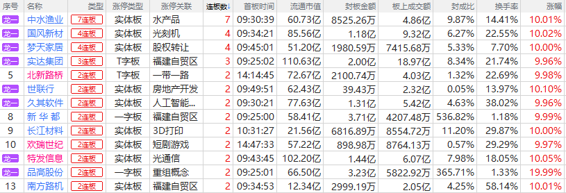 焦点股方面,水产股中水渔业7连板,固态电池概念股国晟科技11天7板,商业航天概念股航天发展7天6板,光刻胶概念股国风新材4连板,股权转让的梦天家居4连板。