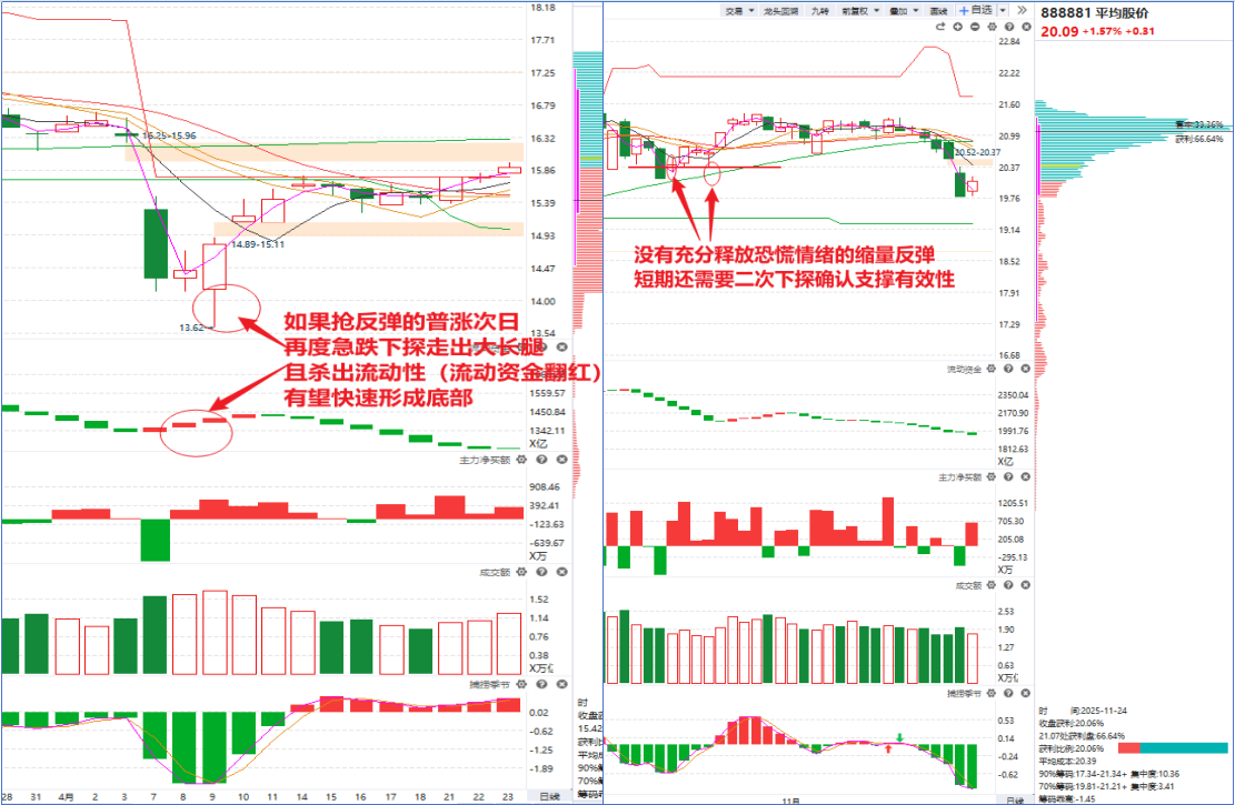 目前平均股价高开缩量反弹,抢修复但没有增量,那后面正常还需要再分歧一次。如果继续上攻且未补量,就可能像10月中旬一样在3-4个交易日内二次下探确认支撑有效性;如果在缩量普涨反弹的第二天,继续急跌下杀走出单针探底的大长腿阳线,且杀出恐慌盘(流动资金翻红),那么就容易在更短的时间内完成筑底结构。
