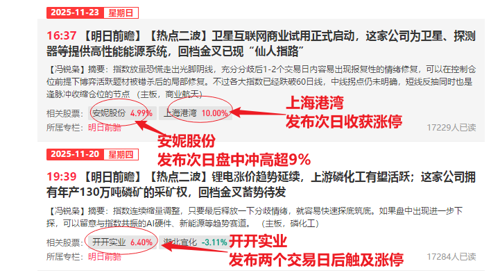 栏目表现还不止于此,周日晚内参中的AI应用概念安妮股份,发布次日冲高超9%收涨5%,11月20日晚内参中的开开实业发布两个交易日便强势拉升触及涨停!