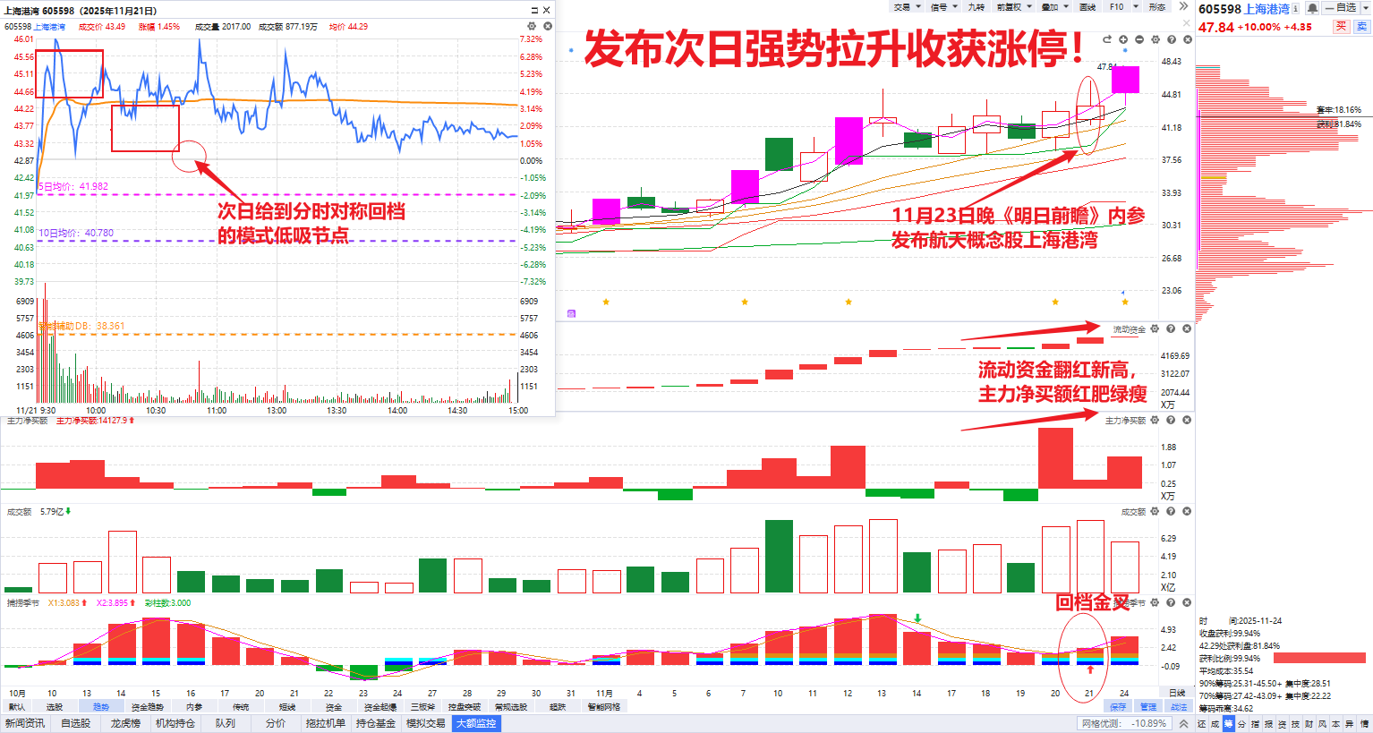 周一情绪修复,航天板块日内爆发涨停潮!恭喜咱们的《明日前瞻》栏目精准狙击风口起爆点,周日晚内参发布航天概念股上海港湾,发布次日立即收获强势涨停,市场赚钱效应刚一回归便马上让跟上节奏的朋友顺势吃肉!