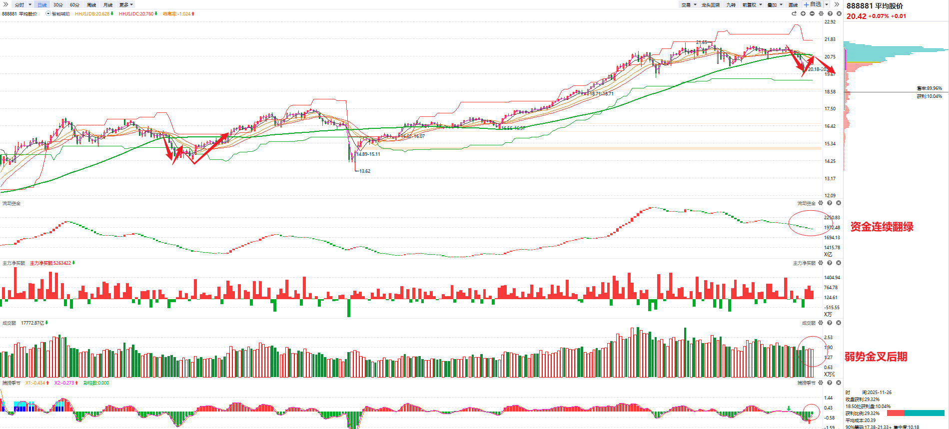指数角度,流动资金连续翻绿新低,捕捞季节绿帽区间的弱势金叉也来到后半段,后面要么等二次回踩,要么等增量进场流动资金翻红了,不然节奏性风险都会逐渐加大。