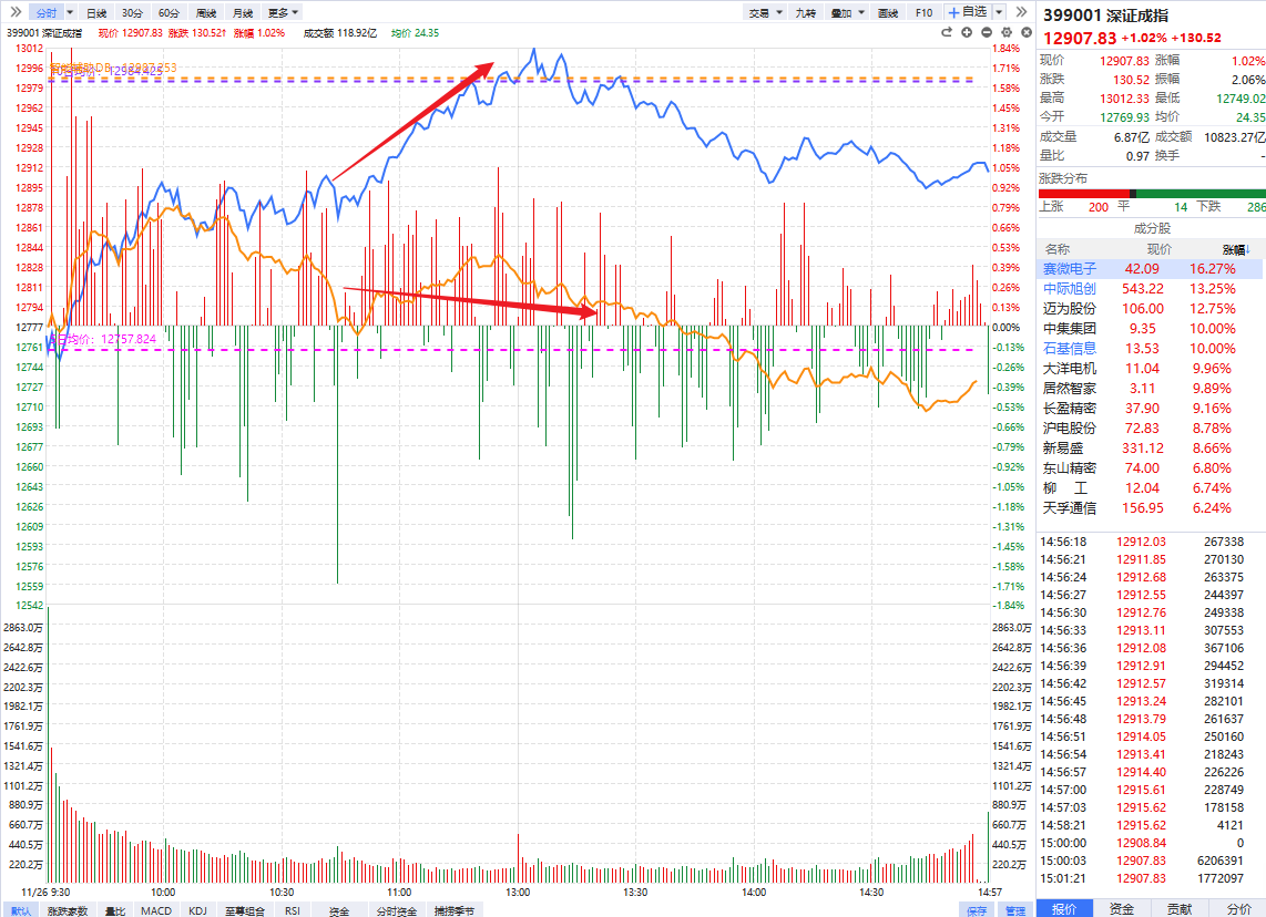 今天市场上各种鬼故事,连板指数高开5个多点都没砸全部硬顶,中际旭创传小作文1.7万亿成交的市场愣是把300亿成交的大票拉出巨阳,一边创业板指盘中涨超3个点一边微盘股指数从日内高点回撤近2个点,深证成指的分时鳄鱼嘴盘中最大时接近2个点。