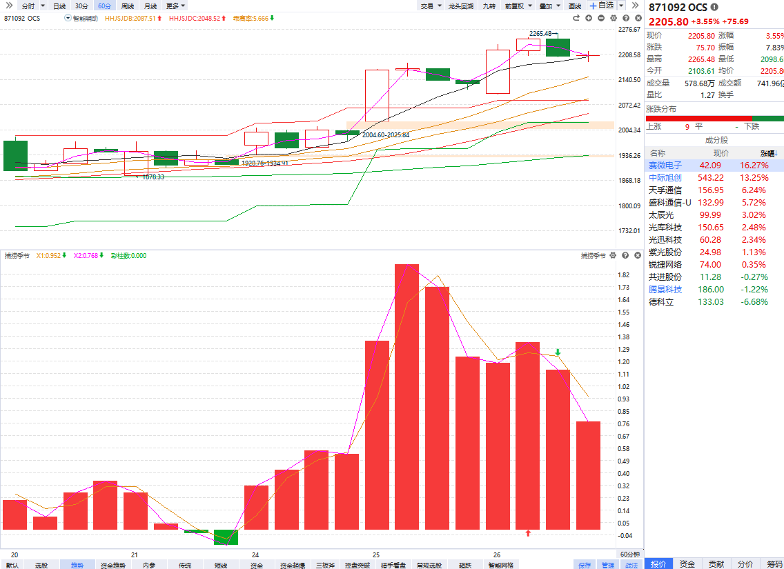光模块/OCS:连续两天大阳拉升但轮动明显,昨天最强的德科立今天马上变成板块最弱,昨天没涨过的赛微、中际接力,说明资金风险偏好比较低,没有打高度的想法,拉过大阳线就马上轮动别的,目前60分钟捕捞季节顶背离死叉,如果没有重大利好继续催化,短线节奏偏向高潮后分化,中期趋势能否延续锚定新高的中际首次回档的反馈。