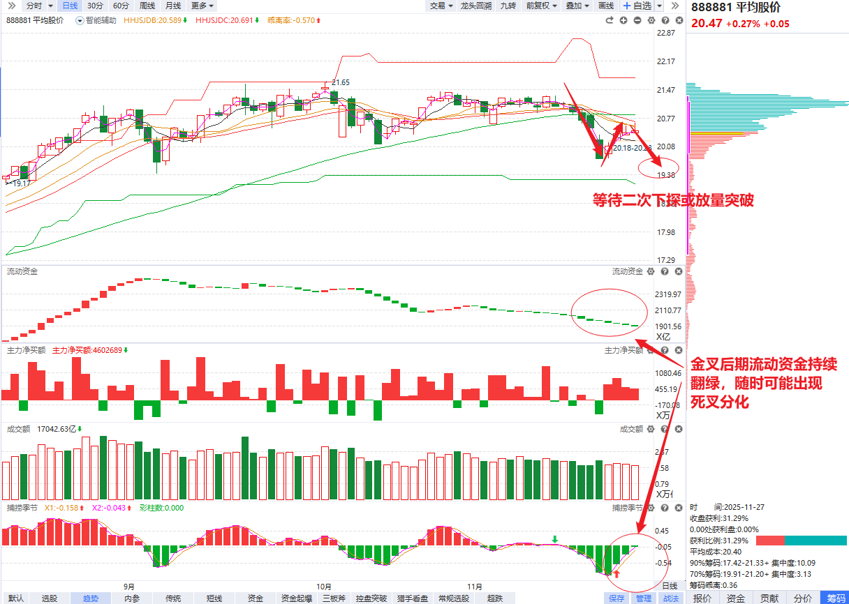 指数角度,平均股价流动资金连续翻绿新低,捕捞季节绿帽区间的弱势金叉也来到后半段,连续上影线上攻未能突破辅助线压力后,后面要么二次下探确认,要么放量突破辅助线,才有下一个确定性节点了,在这之前都要注意控制整体仓位3成左右 ,耐心等待这一波过渡性反弹过后的方向选择。