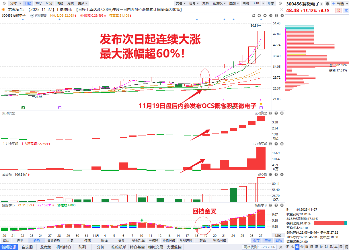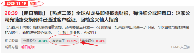 市场连续多个交易日阳线上攻,AI硬件成为最强领涨风口!咱们的《明日前瞻》栏目也紧随这一热点擒牛,11月19日晚内参发布的OCS概念股赛微电子,发布次日便直接起爆开启主升浪,6个交易日最大涨幅超60%!