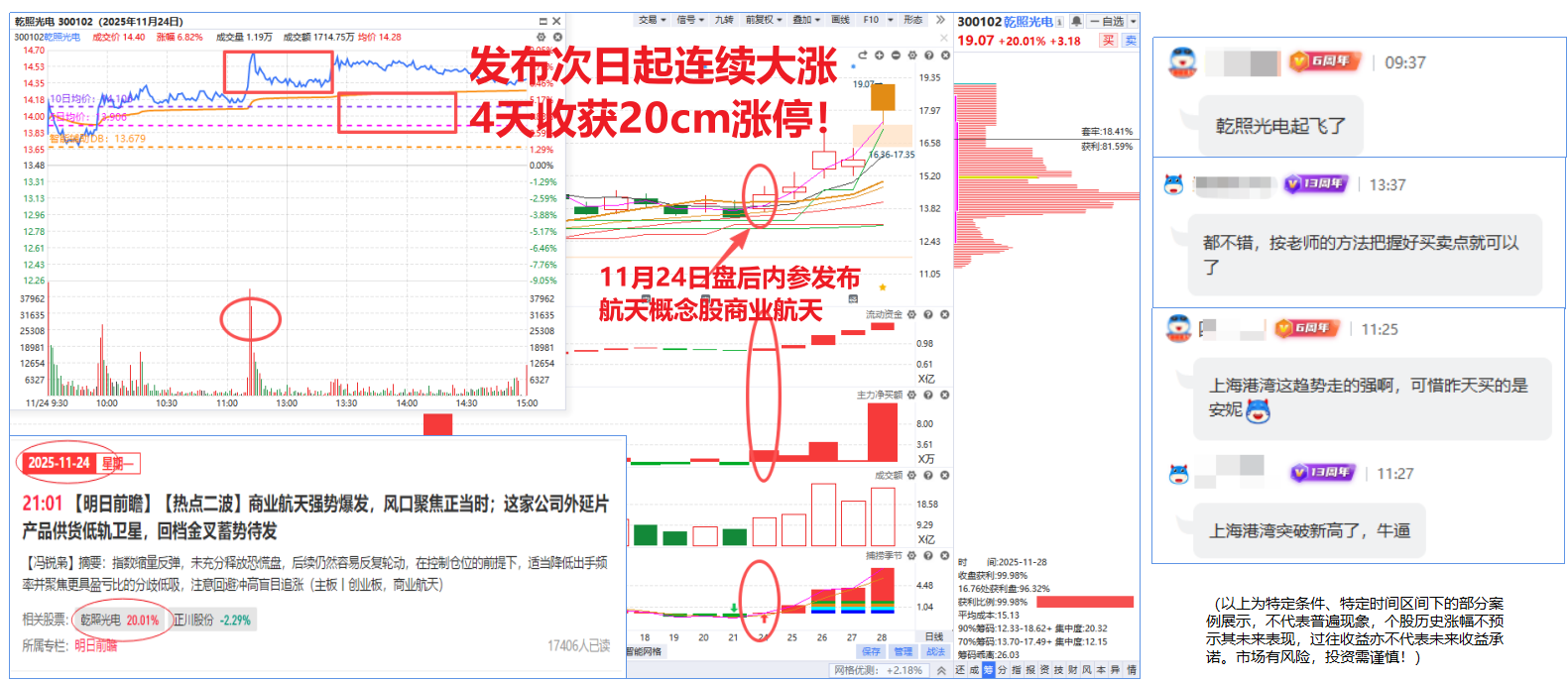 (以上为特定条件、特定时间区间下的部分案例展示,以及公司用户部分较好的反馈展示,不代表普遍现象,个股历史涨幅不预示其未来表现,过往收益亦不代表未来收益承诺。市场有风险,投资需谨慎!)