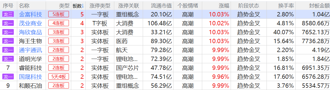 焦点股方面,并购重组的国晟科技15天10板、金富科技5连板,商业航天概念股航天发展11天7板,股权转让的梦天家居8天6板,大消费板块茂业商业4连板。