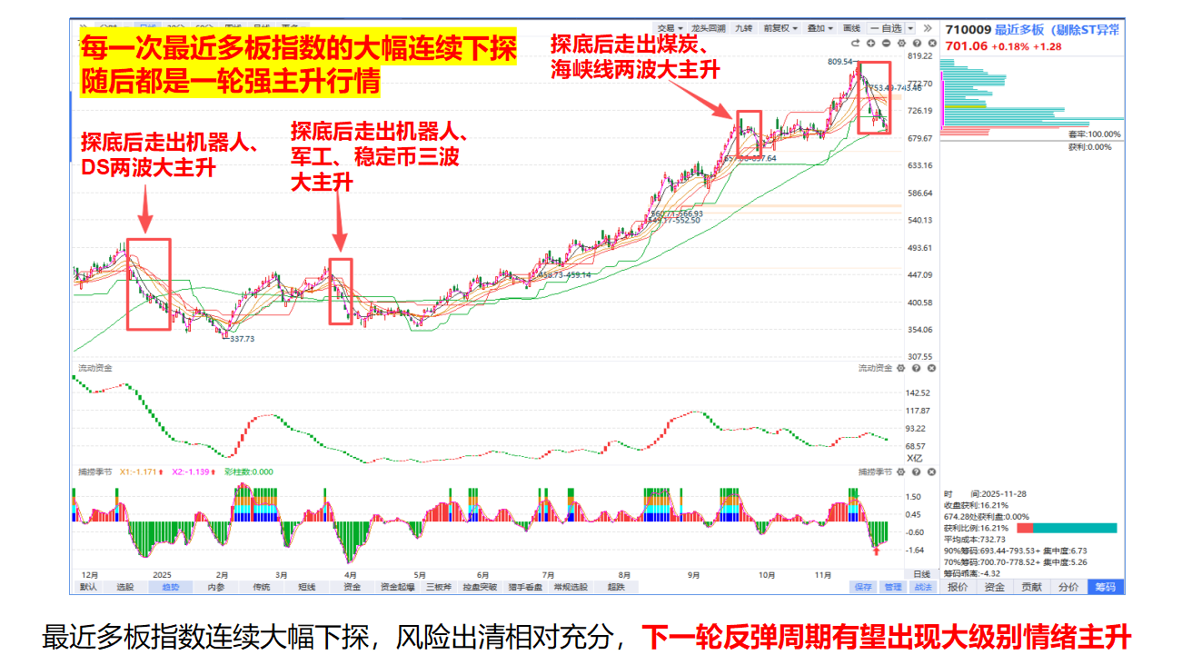 情绪题材的亏钱效应也终于开始修复,断板的高位连板个股没有直接闷杀而是给到反抽冲高的减亏机会,前面一直释放分歧的航天板块也走出强修复,最近多板指数走出连续两波退潮,高度也一度杀到4板,分歧释放比较充分,后面如果最近多板指数企稳60日线,就有望像前面几次一样走出新一波强主升周期,下周应该是一个短线关键节点,具体方向周日文章结合消息面再来看。