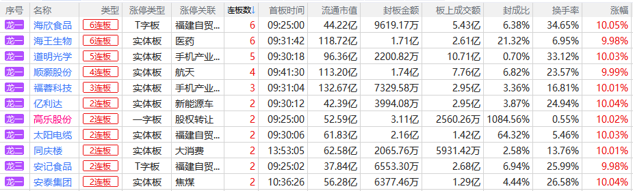 焦点股方面,金富科技上演“天地板”,市场连板高度降至6连板的海王生物、海欣食品,道明光学尾盘回封晋级5连板,商业航天概念股顺灏股份走出4连板。