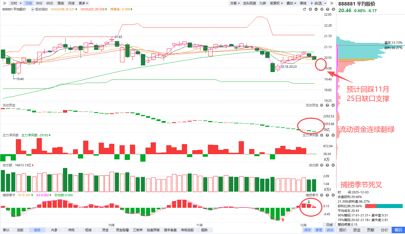 指数角度,平均股价、上证都已经捕捞季节死叉,平均股价流动资金连续翻绿阶段新低,短线预计还会延续分化回踩11月25日缺口支撑,只有二次回踩确认缺口支撑有效,在缺口附近走出地量十字星、探底回升下影线、反包阳线后,才比较适合进行短线博弈,注意尽量不要左侧提前抄底,仓位控制在2-3成左右,耐心等待确定性的右侧信号出现。